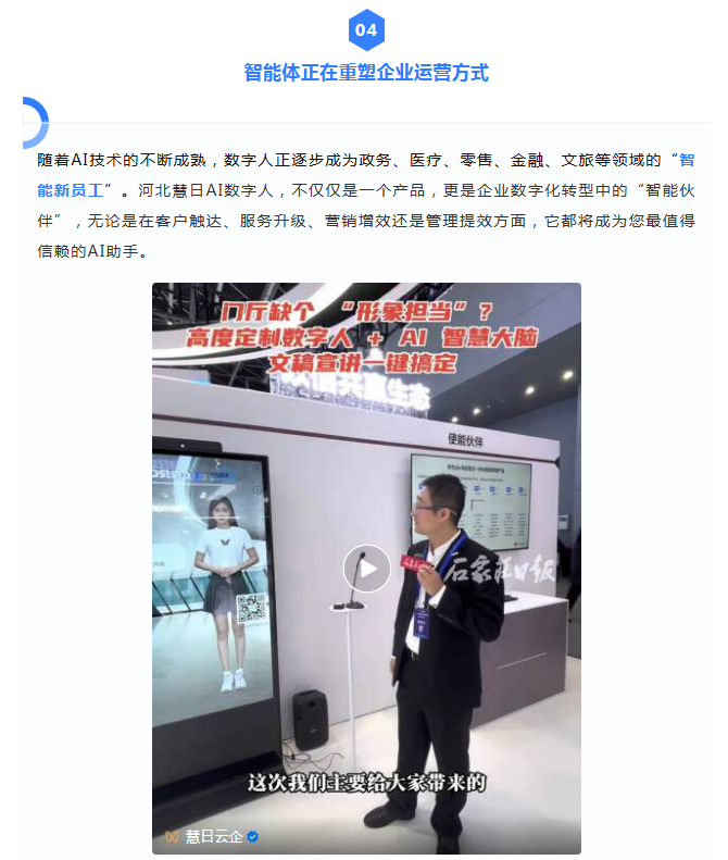10月17日至19日,中国国际数字经济博览会在河北正定盛大举行。作为华为云在河北地区的深度合作伙伴,河北慧日受邀参会展示了全新升级的AI数字人产品,以领先的技术实力与创新的应用场景,成为展会现场的一大亮点。