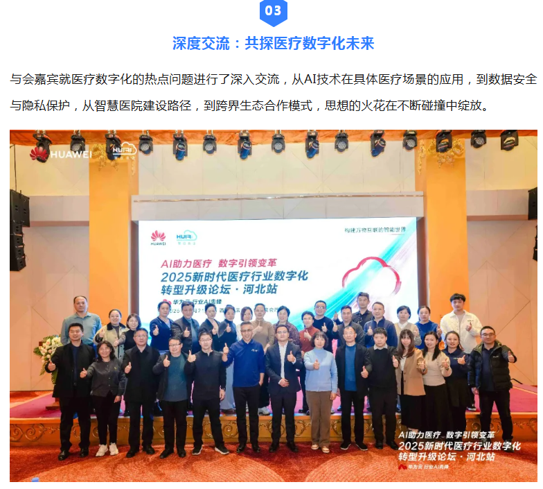 本次论坛不仅展示了AI技术在医疗行业的最新应用成果,更为医疗数字化转型升级指明了方向。河北慧日与华为云将继续深化合作,携手医疗行业各方伙伴,共同推动河北省乃至全国医疗行业向智能化、高效化、安全化方向迈进,让科技真正为人民健康保驾护航。